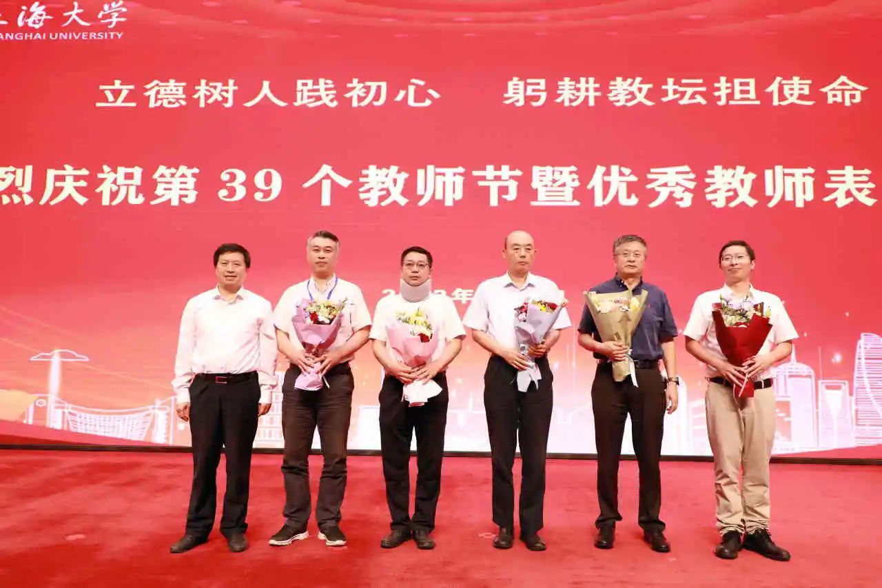 新进教师代表为从教三十年教师代表献花,学习他们矢志不渝为教育事业殚精竭虑的品格。从教三十年教师代表为新进教师代表赠送校徽,鼓励他们传承上大自强不息的精神,爱岗敬业、潜心育人。