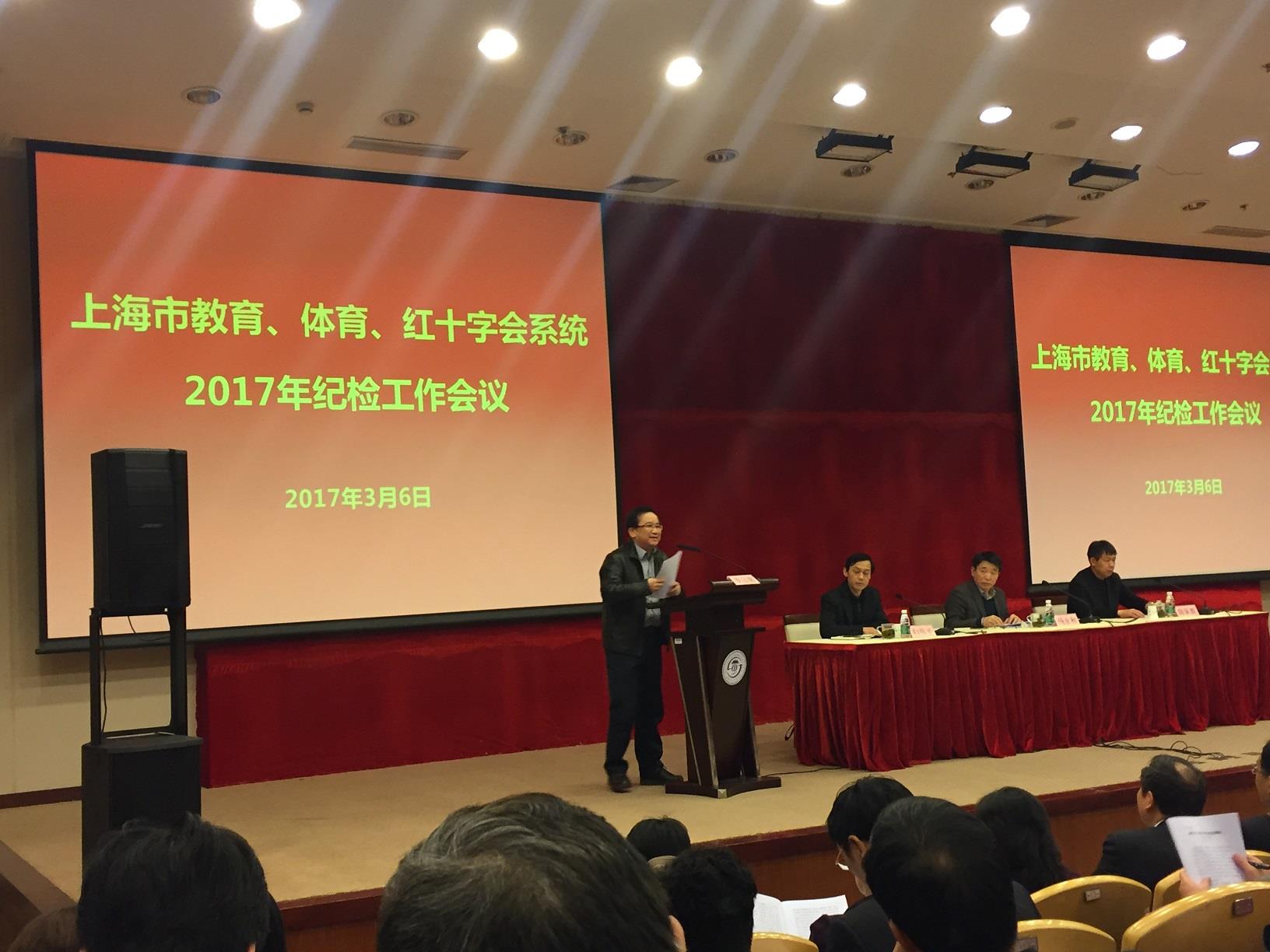 3月6日下午,上海市教育、体育、红十字会系统2017年纪检工作会议在上海交大医学院召开。市纪委驻市教卫工作党委纪检组副组长陈家源同志从五个方面通报了系统2016年纪检工作,并部署了2017年纪检工作任务:严明纪律,突出监督,贯彻落实党的十八届六中全会精神;锲而不舍落实中央八项规定精神,持续深化作风建设;力度不减、节奏不变,巩固反腐败斗争压倒性态势;加大问责力度,推进落实“两个责任”;践行忠诚干净担当,以铁的纪律打造纪检监察干部队伍。